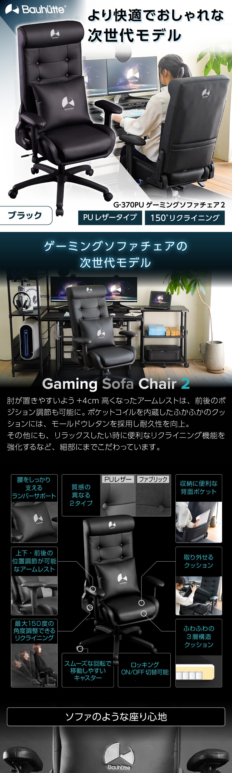 Bauhutte バウヒュッテ G-370PU-BK ゲーミングチェア ブラック ゲーミングソファチェア2 PUレザータイプ