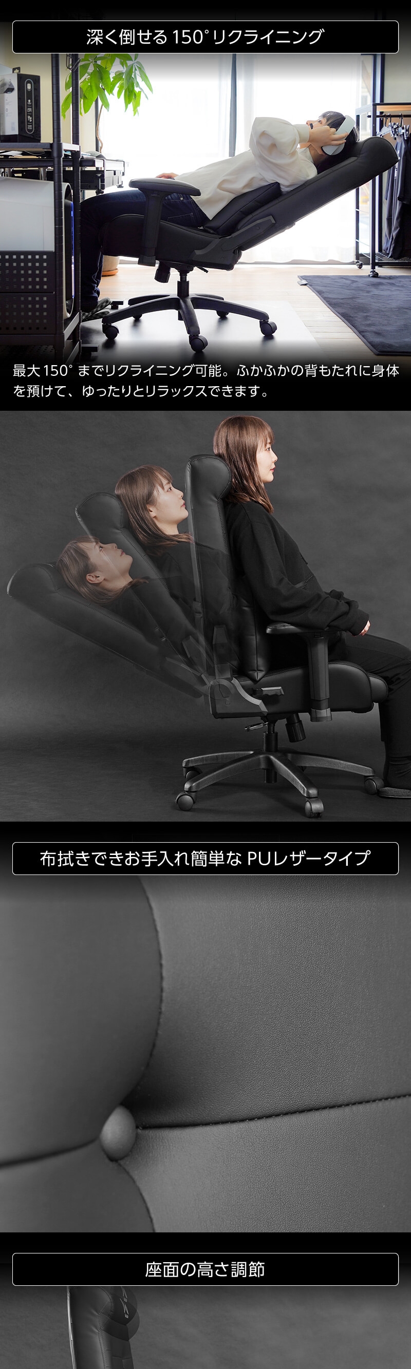 ゲームプレイやPC作業中の正しい座り姿勢をサポートして、長時間座りっぱなしでも疲れにくい快適な座り心地を実現します。