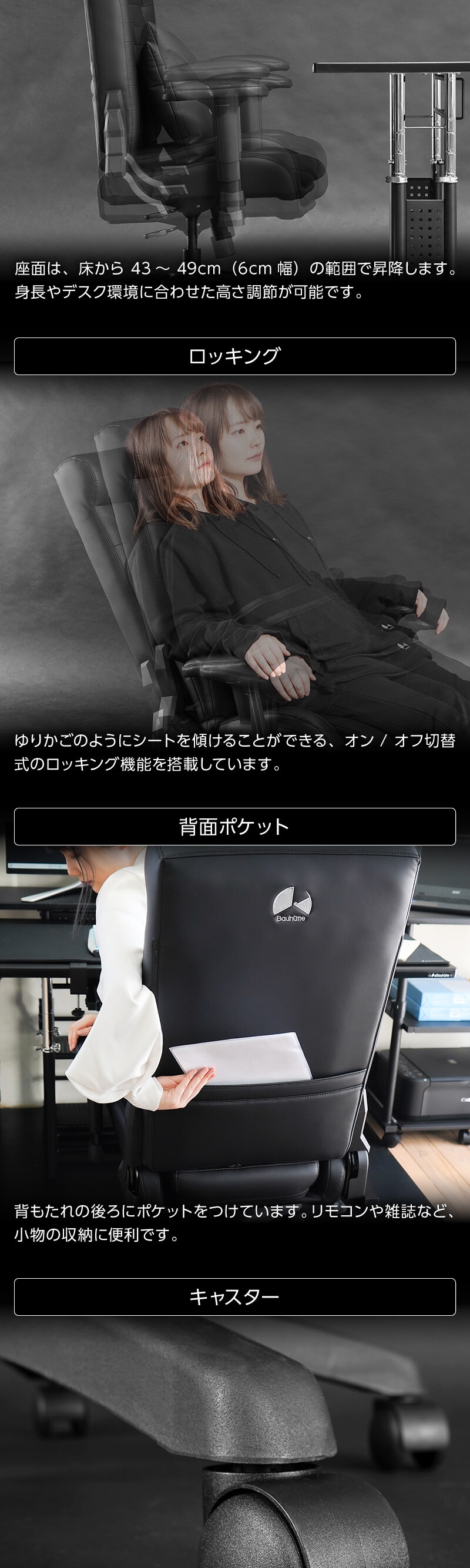 座面は、床から43~49cm(6cm幅)の範囲で昇降します。