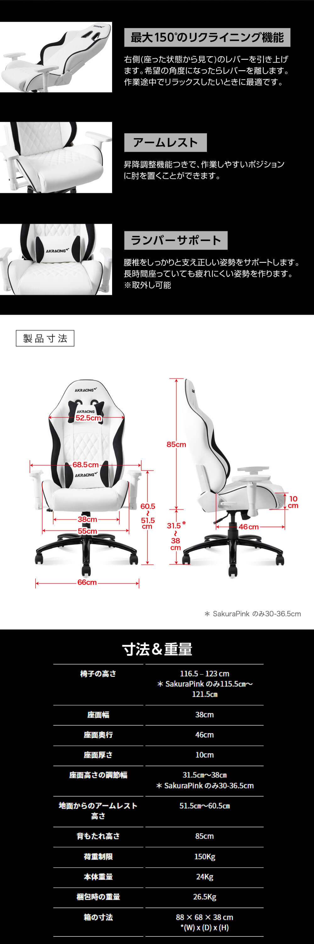 | 寸法 | 椅子の高さ:116.5~123cm 座面幅:38cm 座面奥行:45cm 座面厚さ:10cm 座面高さ:30~36.5cm アームレスト高さ:21.5~25cm 背もたれ高さ:85cm |