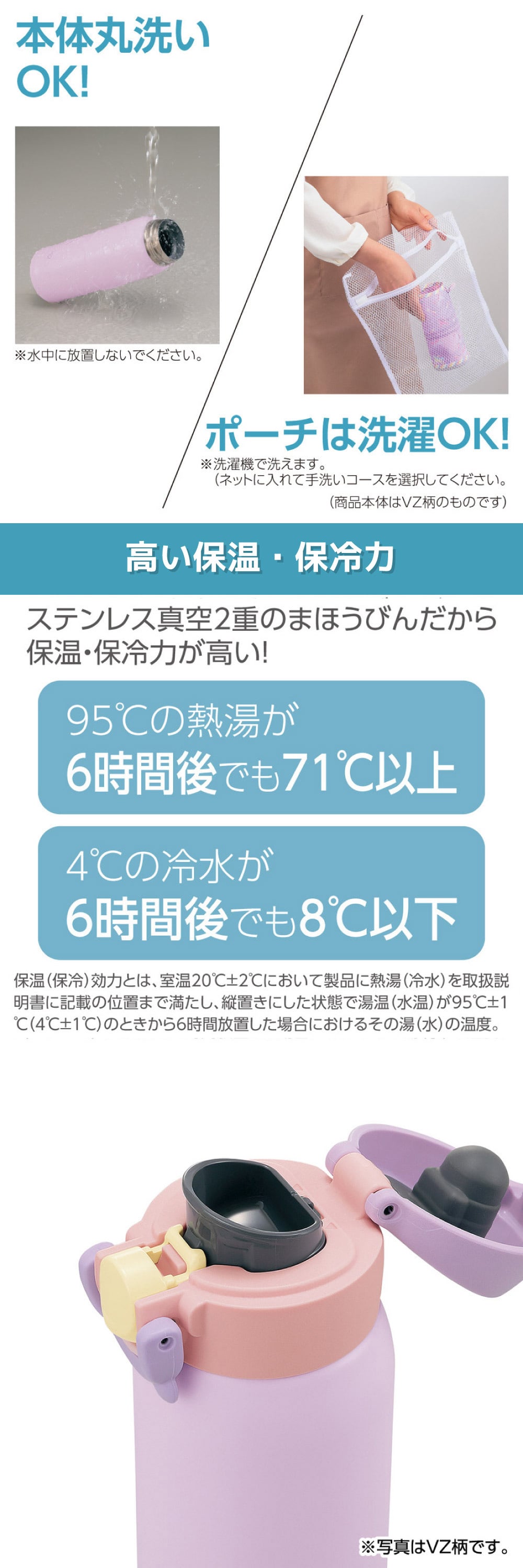 ※2 保冷効力とは、室温20℃±2℃において製品に冷水を取扱説明書に記載の位置まで満たし、縦置きにした状態で水の温度が4℃±1℃の時から6時間放置した場合におけるその水の温度。