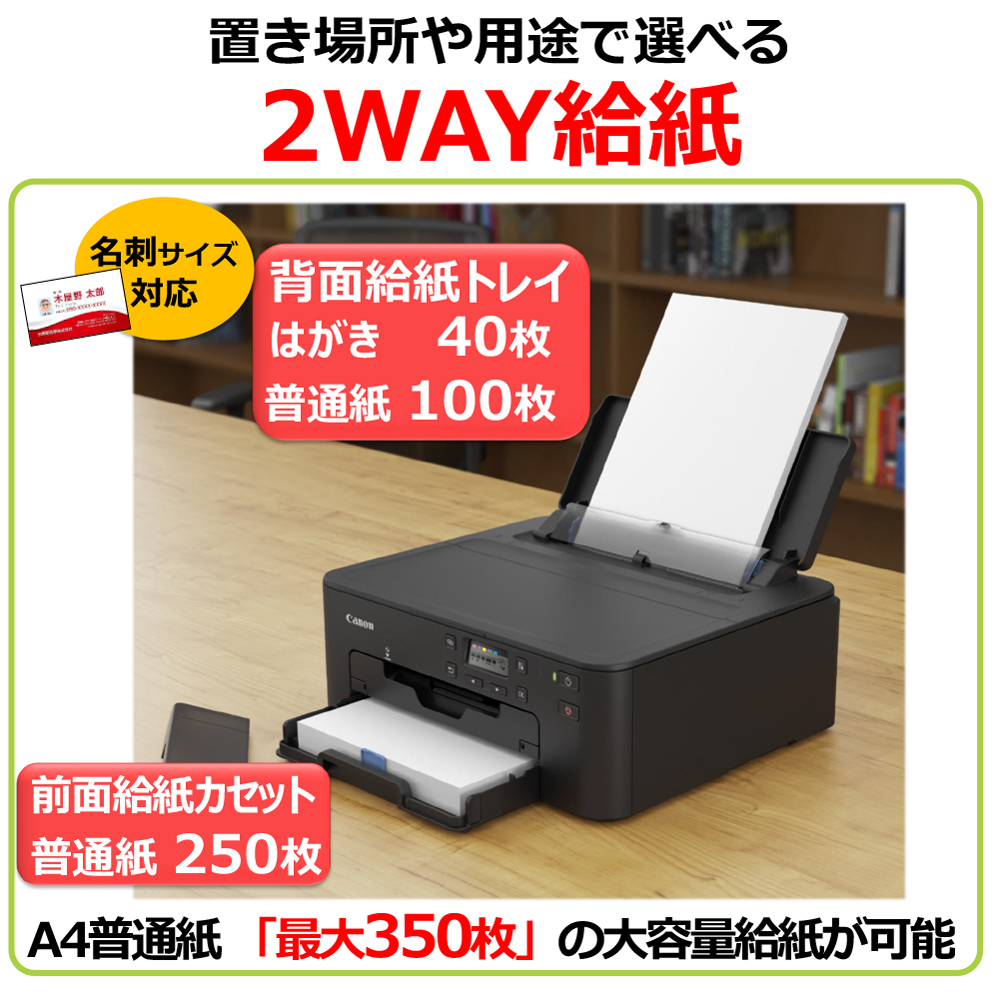 A4普通紙で前面カセット250枚、後ろトレイ100枚の計350枚の大容量給紙が可能です