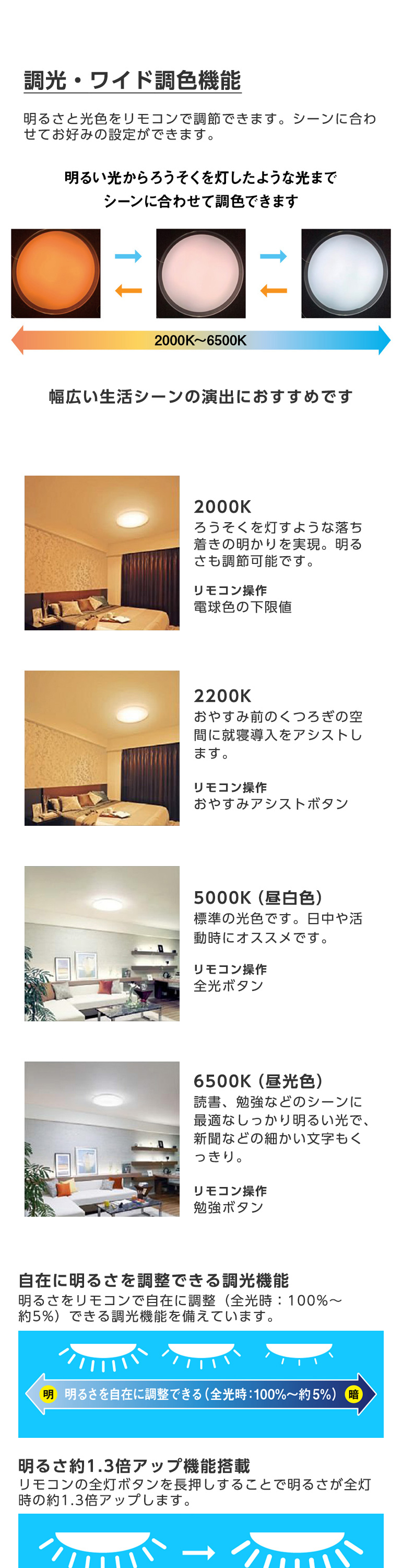 LEDシーリングライトの特長とも言える調色の幅が広いタイプで、ろうそくを灯したように赤みがかった色を再現できます。幅広い生活シーンの演出におすすめです。