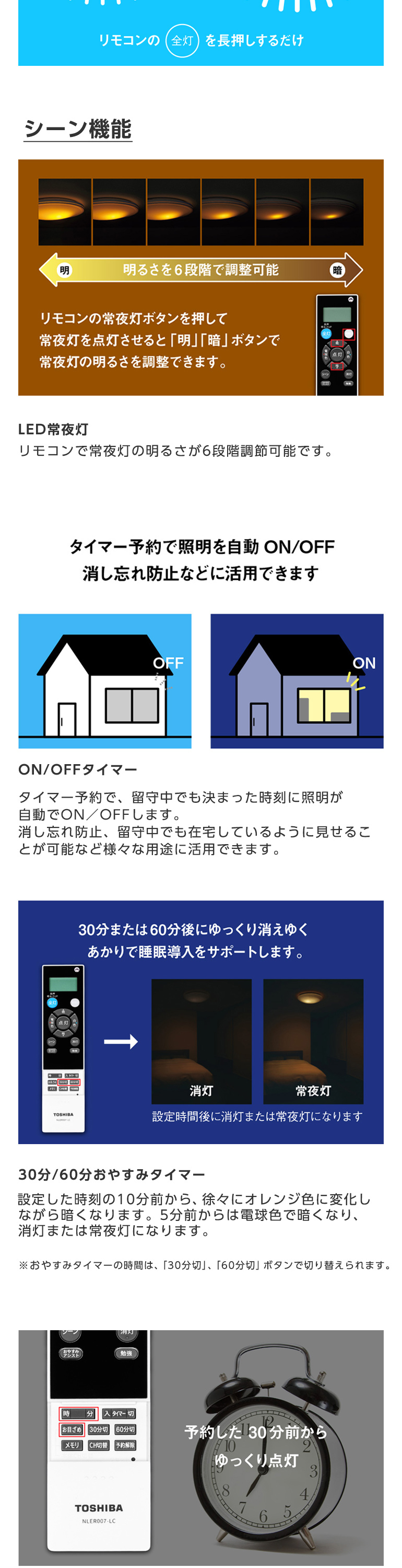 30分または60分後にゆっくり消えゆくあかりです。設定した時刻の10分前から、徐々にオレンジ色に変化しながら暗くなります。5分前からは電球色で暗くなり、消灯または常夜灯になります。