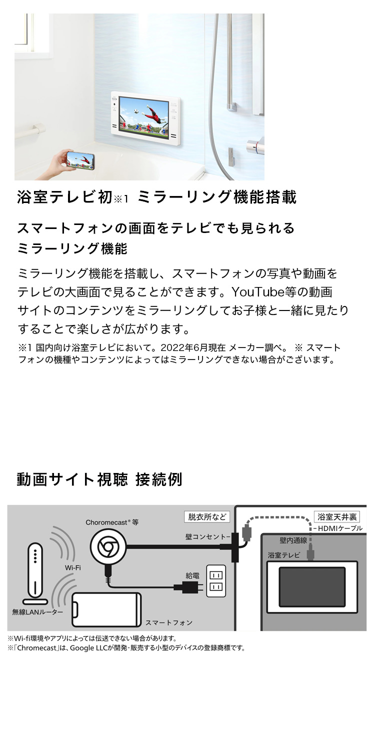 スマートフォンの画面をテレビでも見られるミラーリング機能を搭載した日本製の浴室テレビです。