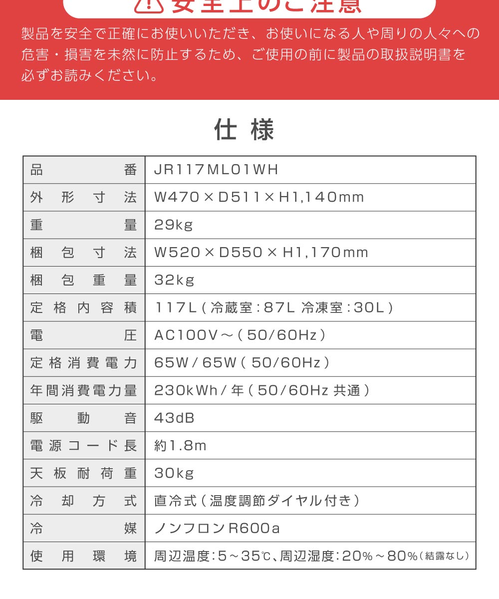 * 定格内容積:117L (冷蔵室:87L 冷凍室:30L)