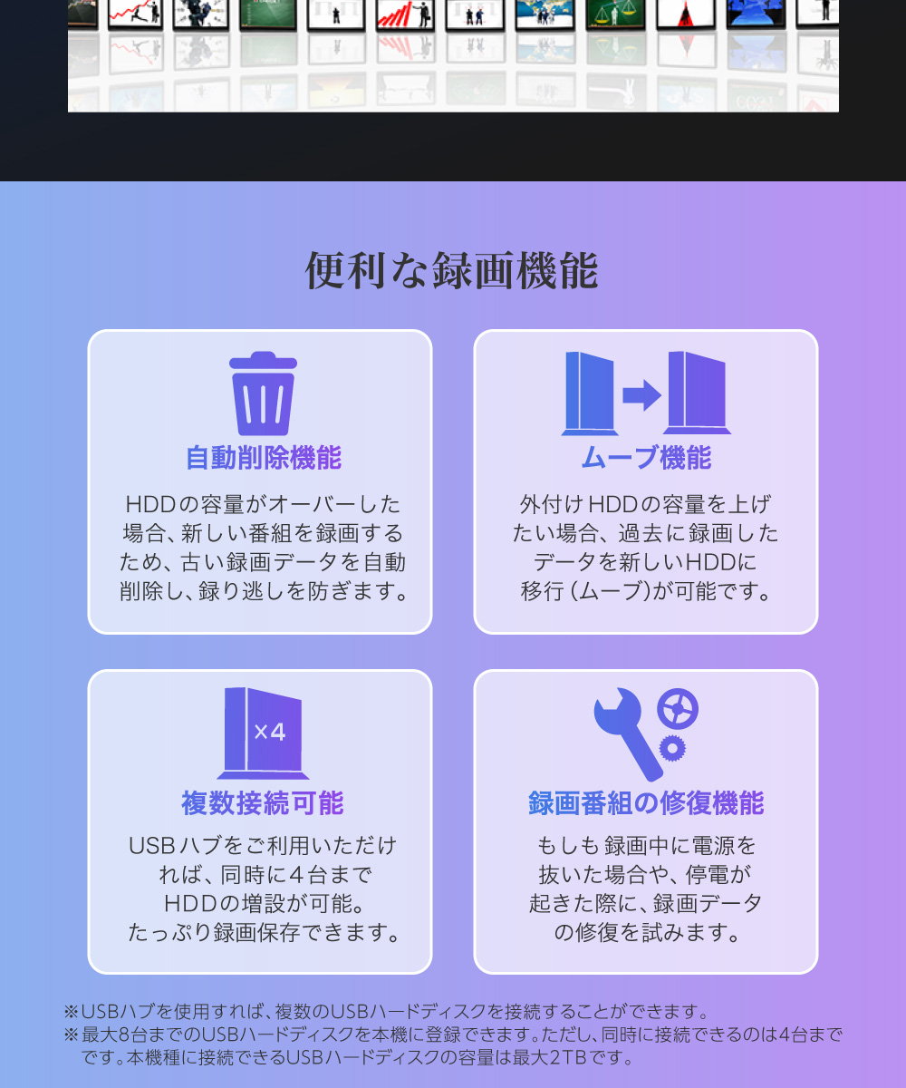 ※最大8台までのUSBハードディスクを本機に登録できます。ただし、同時に接続できるのは4台までです。本機種に接続できるUSBハードディスクの容量は最大2TBです。