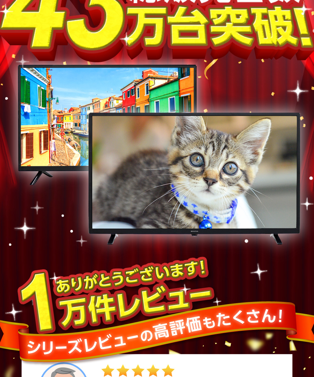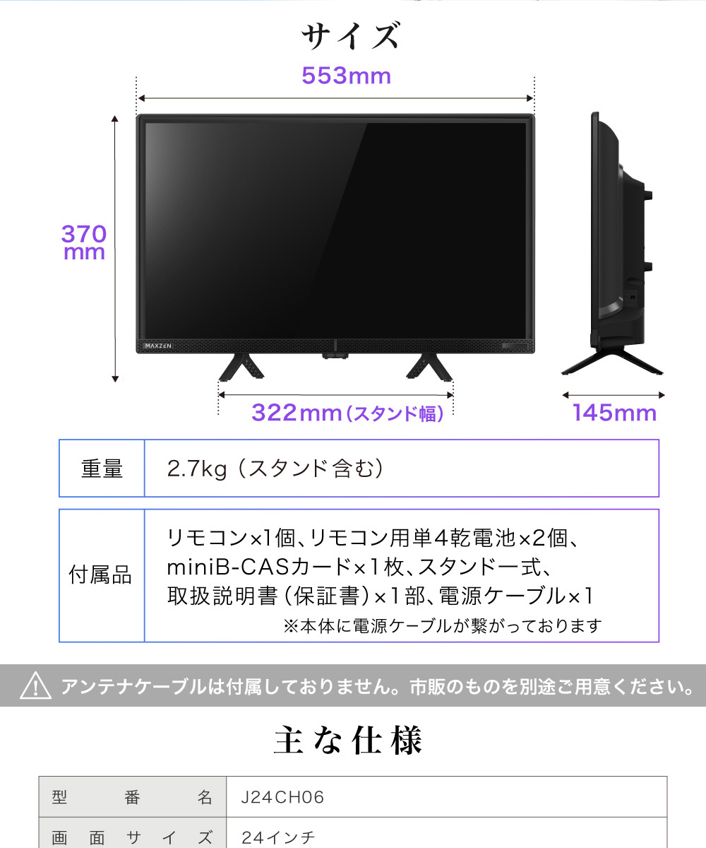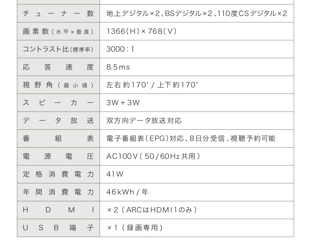 * 付属品:リモコン×1個、リモコン用単4乾電池×2本、miniB-CASカード×1枚、スタンド一式、取扱説明書(保証書付き)×1部、電源ケーブル×1本