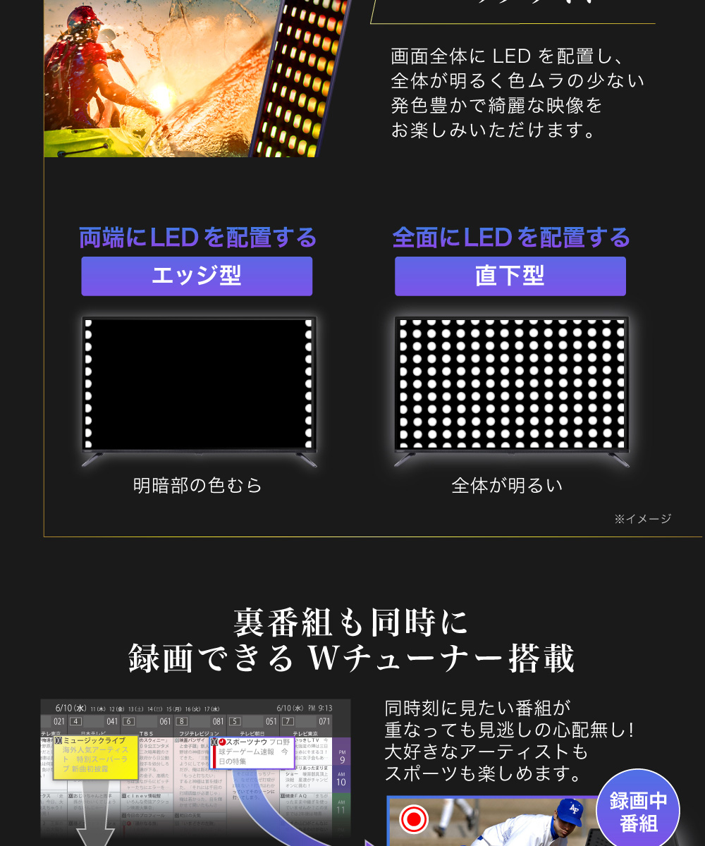 画面全体にLEDを配置し、全体が明るく色ムラの少ない発色豊かで綺麗な映像をお楽しみいただけます。
