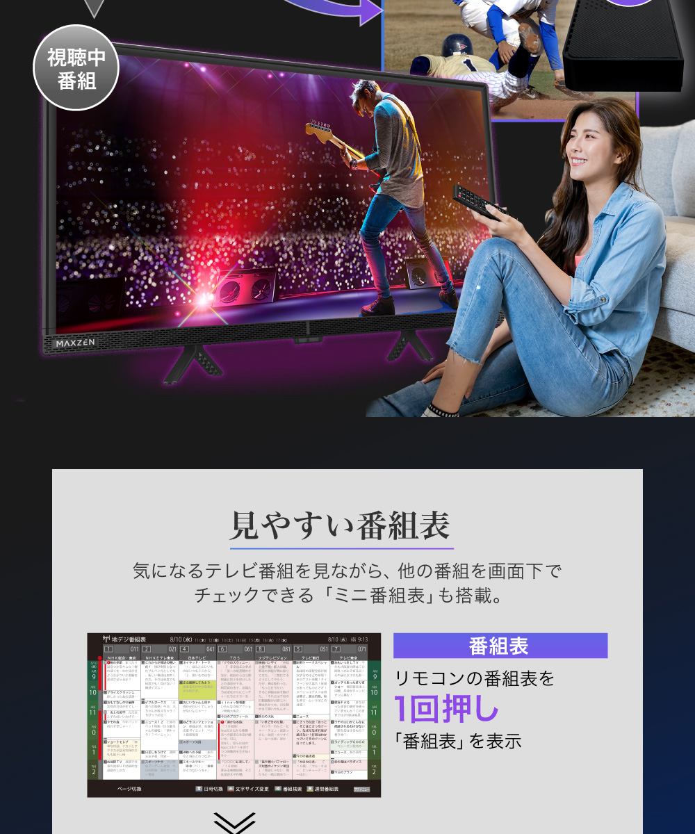 気になるテレビ番組を見ながら、他の番組を画面下でチェックできる「ミニ番組表」も搭載。