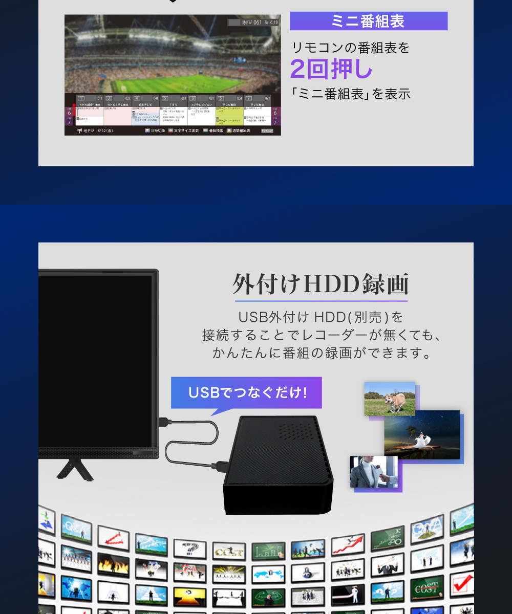 USB外付けHDD(別売)を接続することでレコーダーが無くても、かんたんに番組の録画ができます。