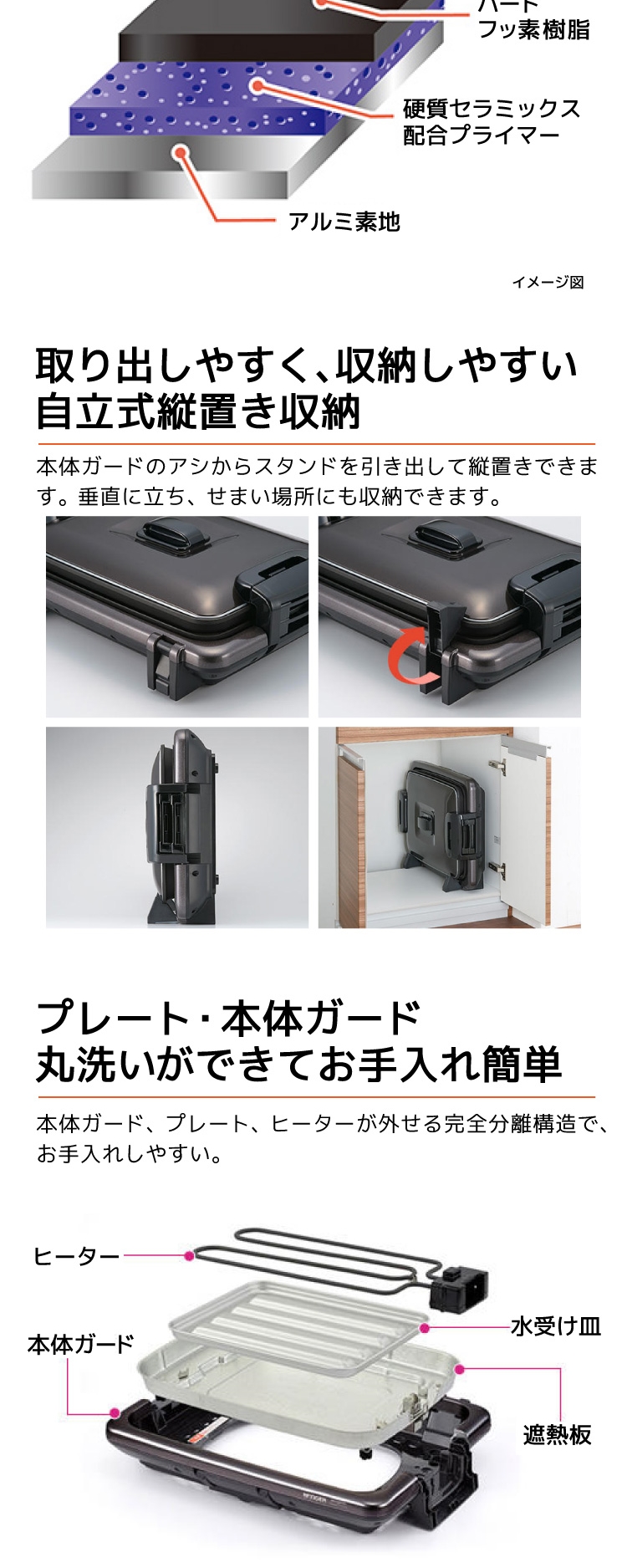 各プレートに硬質セラミックスハードフッ素コーティングを施しているので、耐久性に優れており、長くご使用頂けます。