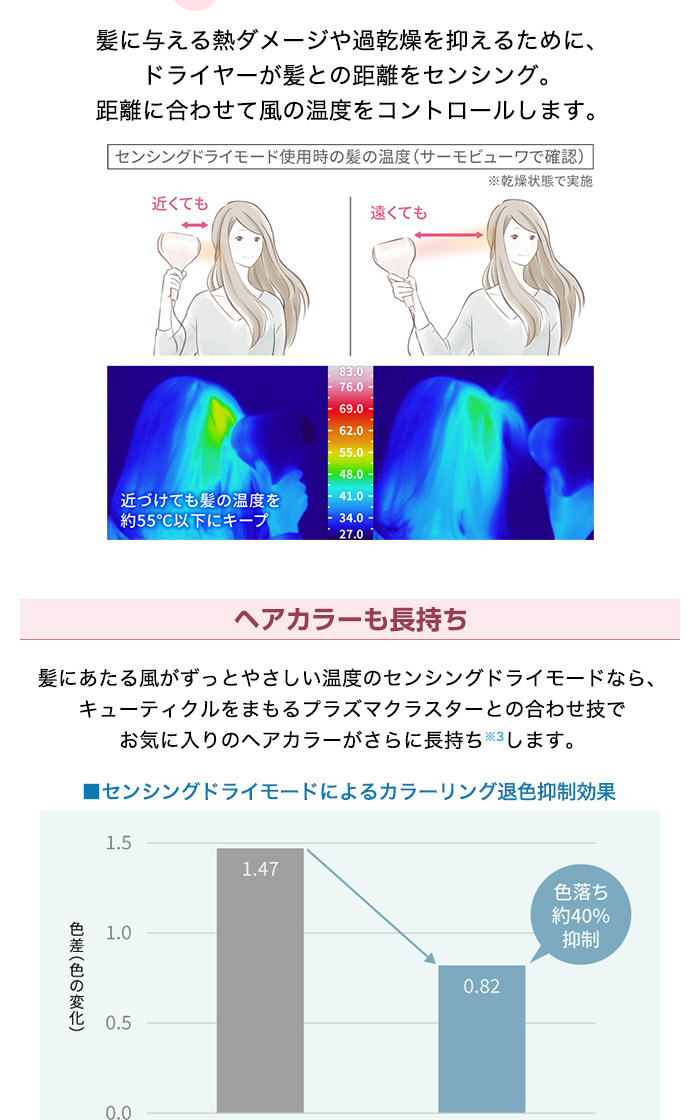 ヘアカラーした髪は、熱風が苦手。髪にあたる風がずっとやさしい温度のセンシングドライモードなら、キューティクルをまもるプラズマクラスターとの合わせ技でお気に入りのヘアカラーがさらに長持ちします。