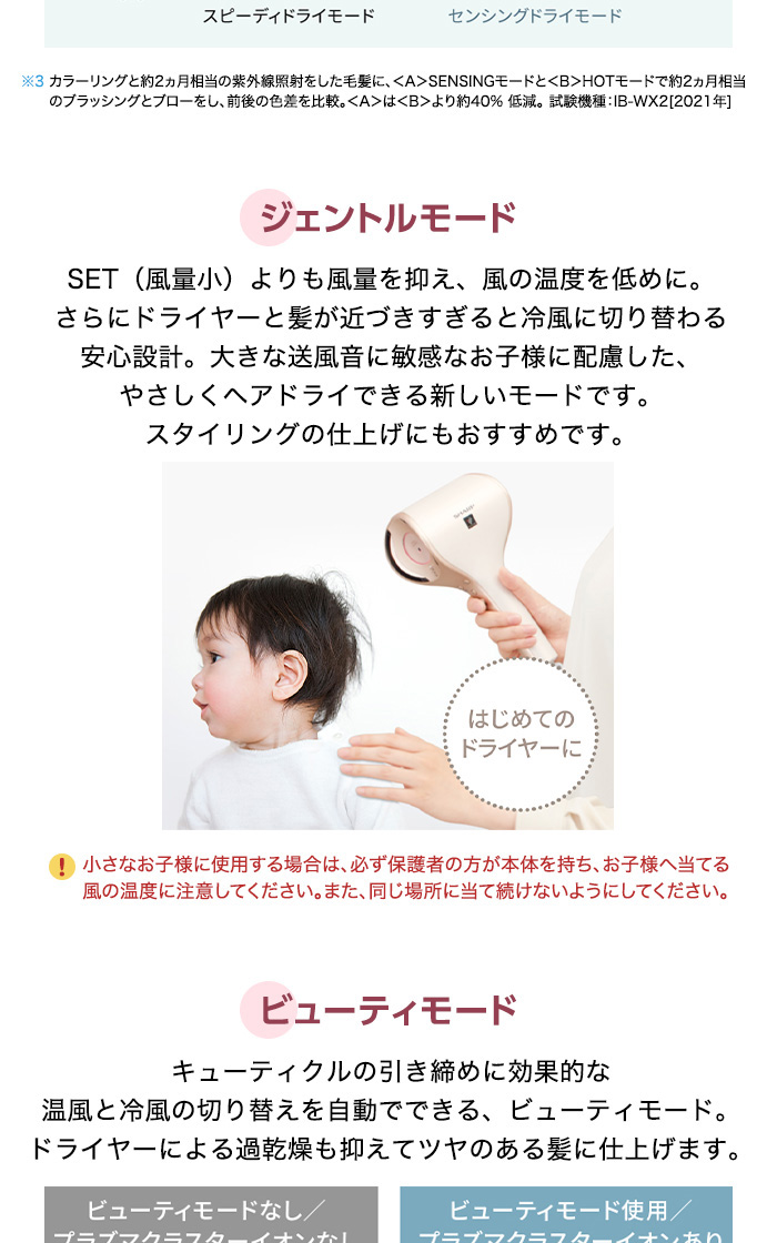 SET(風量小)よりも風量を抑え、風の温度を低めに。さらにドライヤーと髪が近づきすぎると冷風に切り替わる安心設計。大きな送風音に敏感なお子様に配慮した、やさしくヘアドライできる新しいモードです。スタイリングの仕上げにもおすすめです。