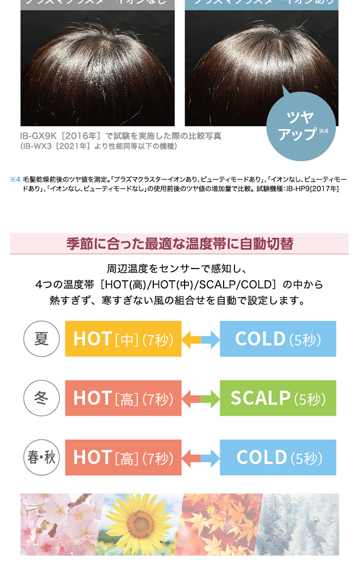 周辺温度をセンサーで感知し、4つの温度帯「HOT(高)/HOT(中)/SCALP/COLD」の中から熱すぎず、寒すぎない風の組合せを自動で設定します。