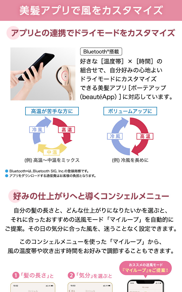 好きな「温度帯」×「時間」の組合せで、自分好みの心地よいドライモードにカスタマイズできる美髪アプリ「ボーテアップ(beauteApp)」に対応しています。