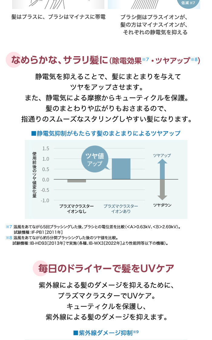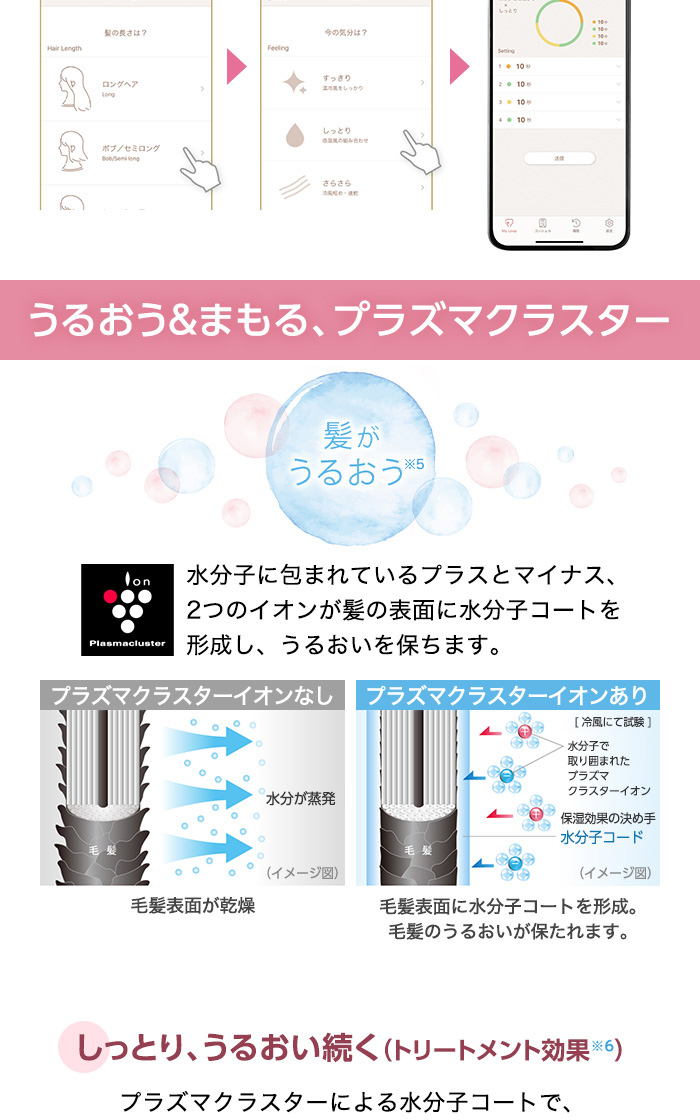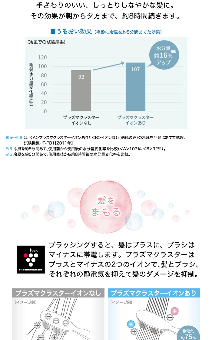 プラズマクラスターによる水分子コートで、手ざわりのいい、しっとりしなやかな髪に。その効果が朝から夕方まで、約8時間続きます。