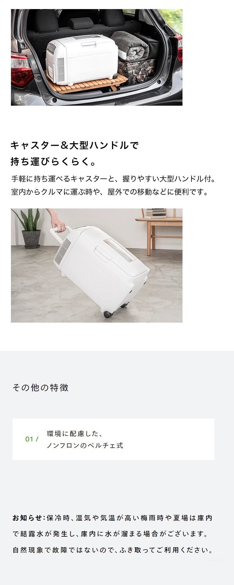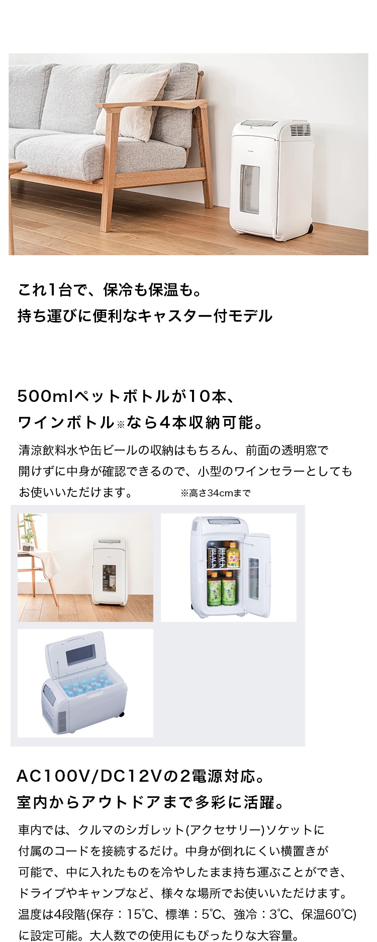 室内はもちろん、車に積んでアウトドアでも活躍。前面の透明窓で、開けずに中身が確認可能。車内では、車のシガーソケットに付属のコードを接続するだけで使えます。