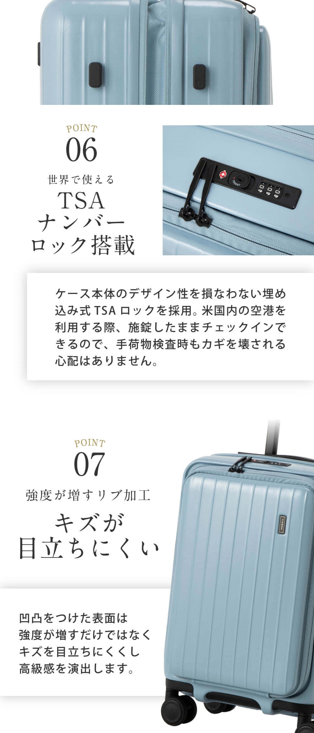 ケース本体のデザイン性を損なわない埋め込み式TSAロックを採用。