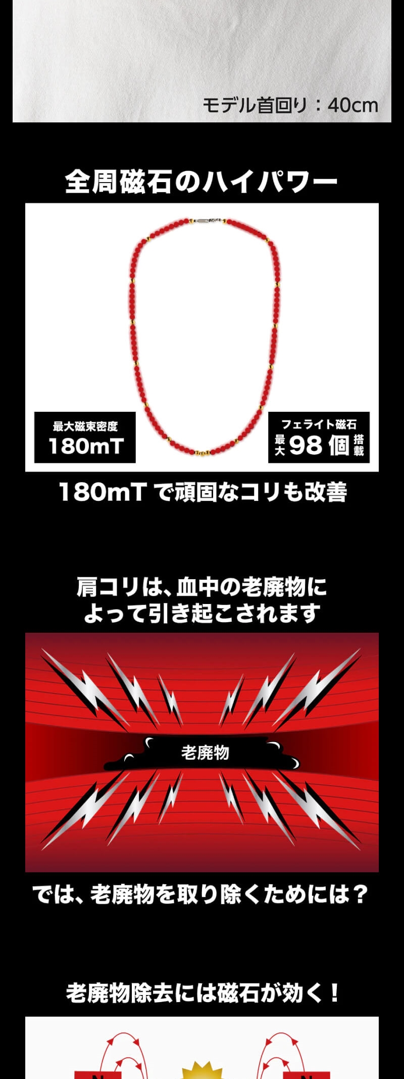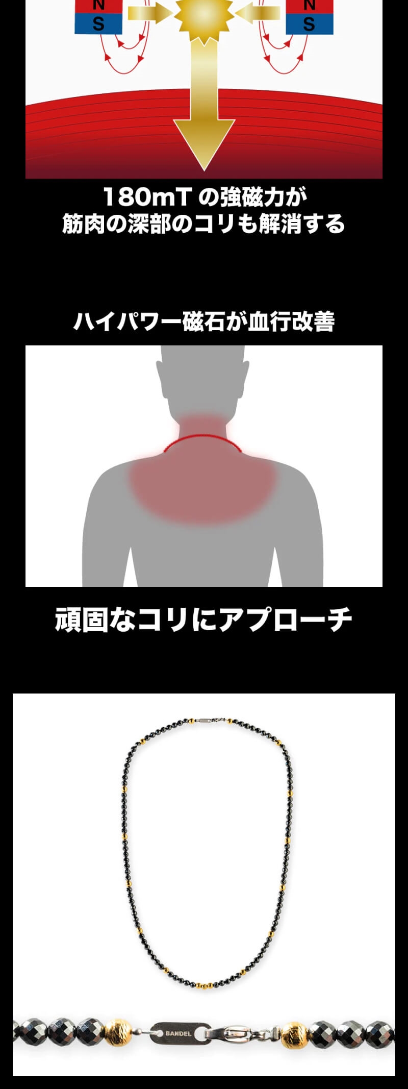 サイズに応じて95粒または115粒のビーズが連なる煌びやかなジュエリーのような見た目でありながら、最大磁束密度180mTの強力な磁力が首・肩のこりの緩和と血行の促進に作用する管理医療機器認証を取得した永久磁石磁気治療器です。