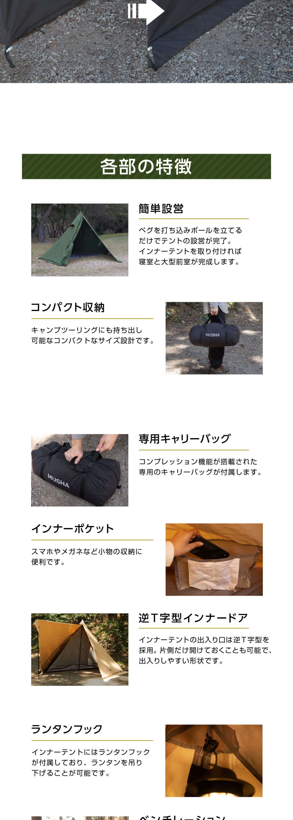 ソロで使うのにぴったりなサイズの寝室、高さがあり秘密基地のように囲われた前室、目隠しや風除けとしてアレンジできるキャノピー、ソロキャンプを快適に楽しめる要素を満たしながら無駄のないコンパクトな設計です。