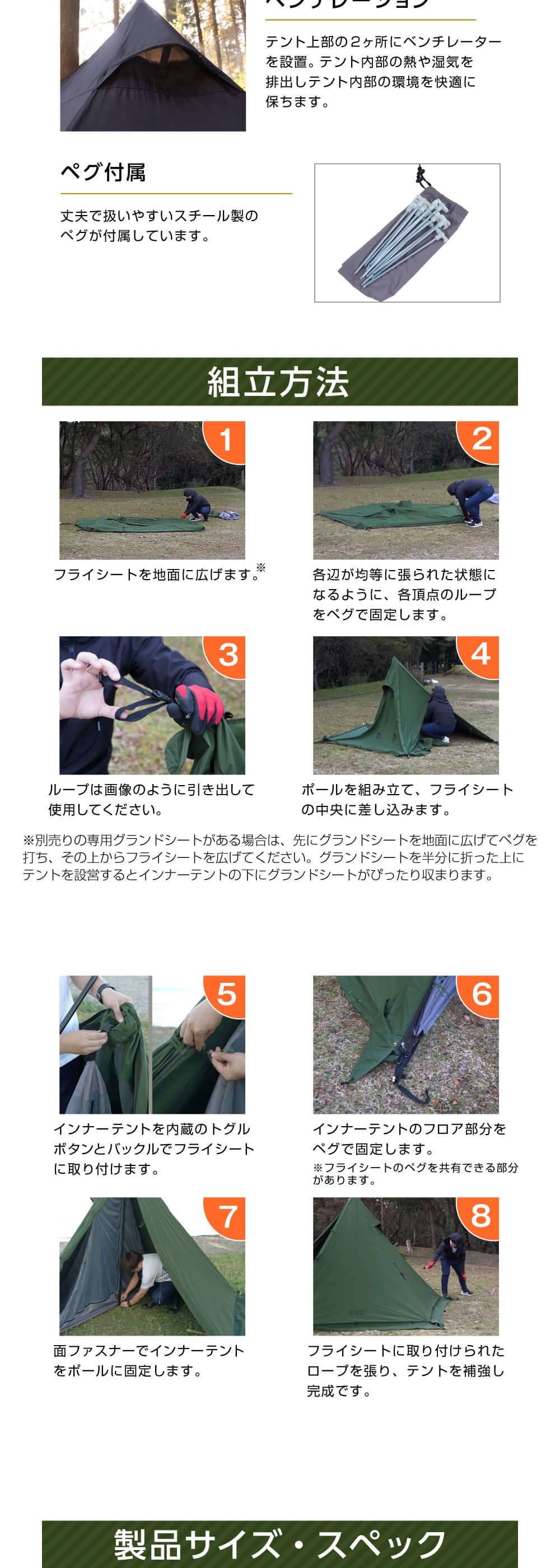 * セット内容: フライシート、インナーテント、ポール×1本、ペグ×13本、ロープ×7本(5本はテントに取り付け済)、キャリーバッグ、キャリーバッグ(ポ