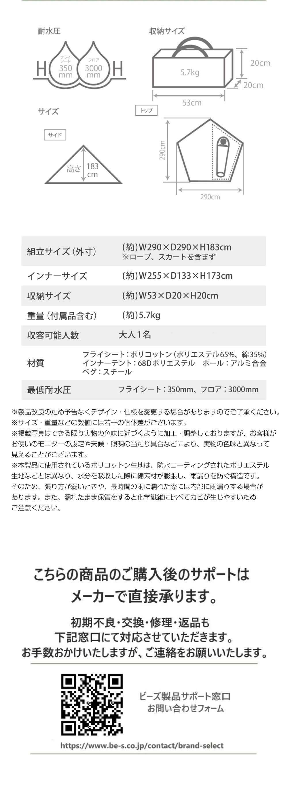 ※ 本製品に使用されているポリコットン生地は、防水コーティングされたポリエステル生地などとは異なり、水分を吸収した際に綿素材が膨張し、雨漏りを防ぐ構造です。そのため、張り方が弱いときや、長時間の雨に濡れた際には内部に雨漏りする場合があります。また、濡れたまま保管をすると化学繊維に比べてカビが生じやすいためご注意ください。