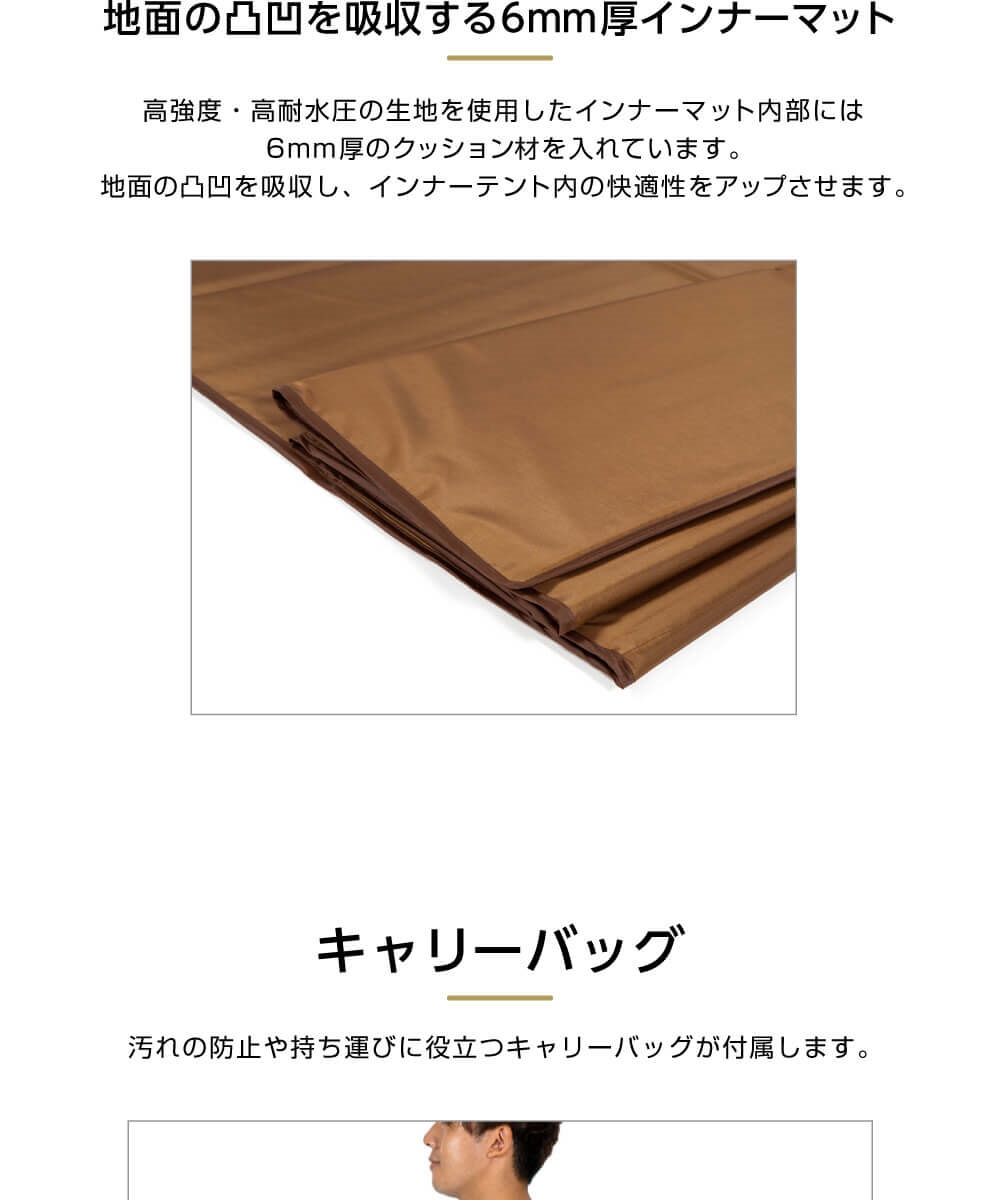 高強度・高耐水圧の生地を使用したインナーマット内部には6mm厚のクッション材を入れています。地面の凸凹を吸収し、インナーテント内の快適性をアップさせます。
