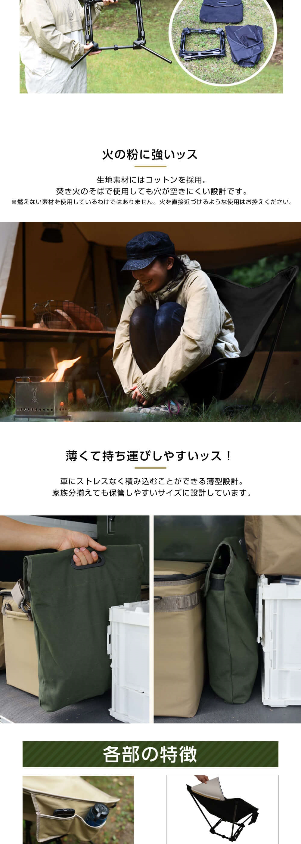 生地素材にはコットンを採用。焚き火のそばで使用しても穴が空きにくい設計です。