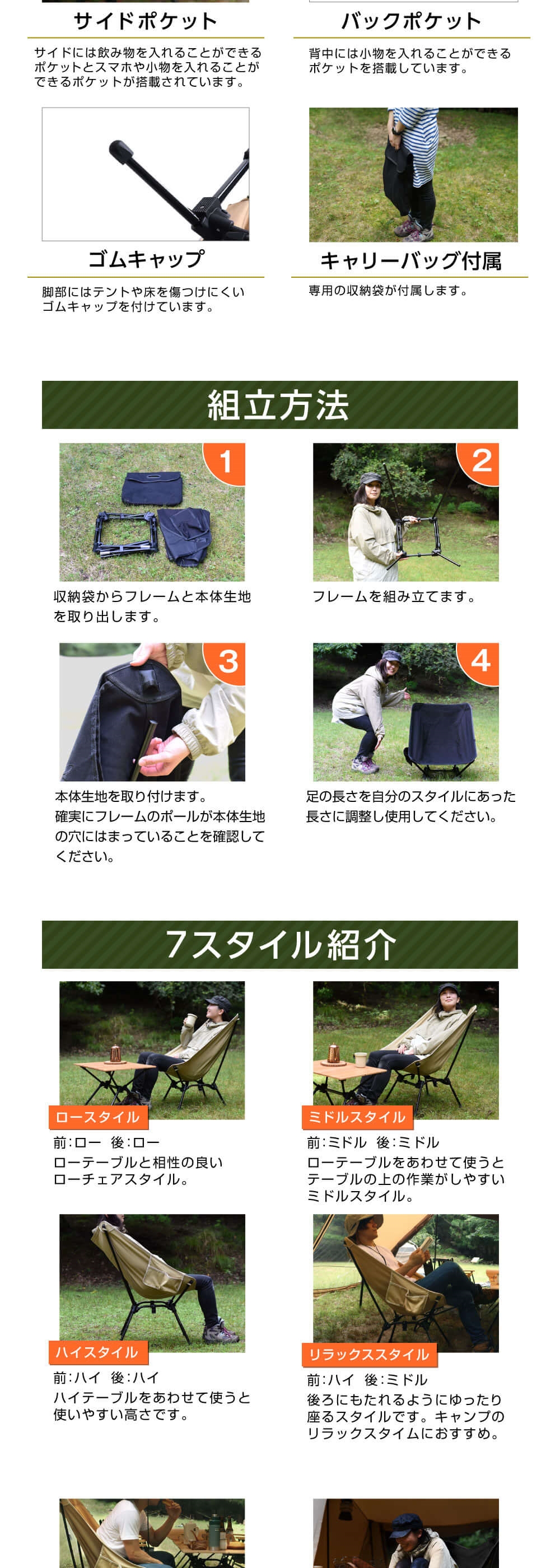 前後の脚の長さを調整することで角度の調整が可能です。食事がしやすい前傾から星空を眺められる後傾のリラックススタイルまで幅広く対応。