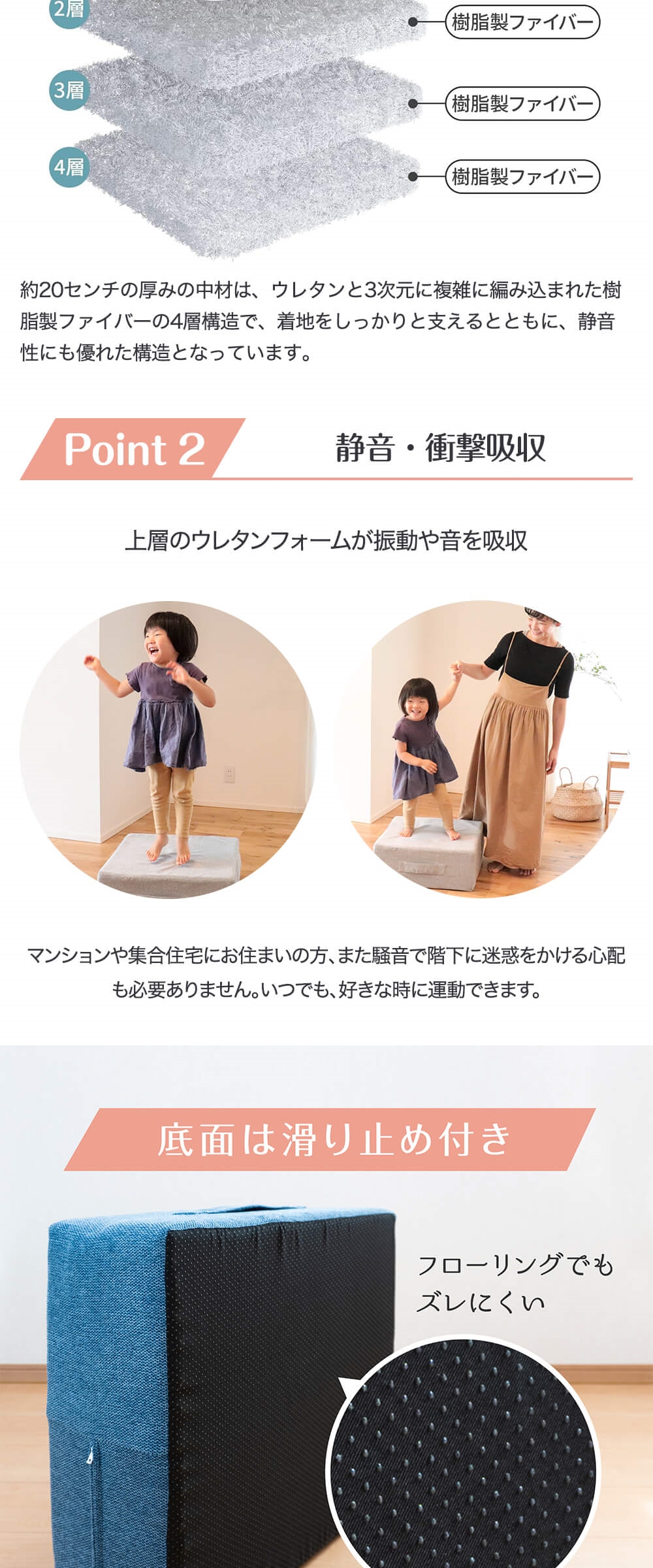 約20センチの厚みの中材は、ウレタンと3次元に複雑に編み込まれた樹脂製ファイバーの4層構造で、着地をしっかりと支えるとともに、静音性にも優れた構造となっています。また、底面には滑り止めがついているため、ジャンプをしてもクッションが動きにくく、お子様でも安心してお使いいただける作りとなっております!