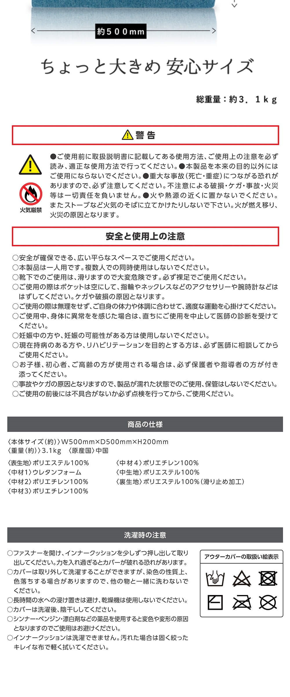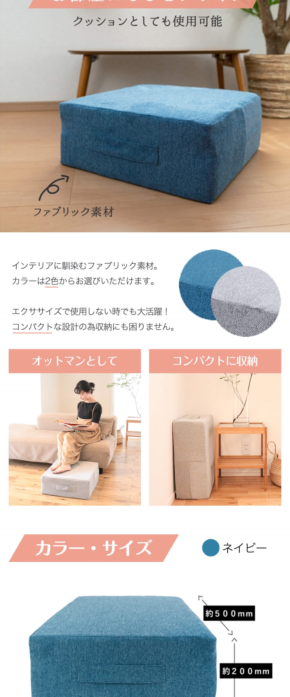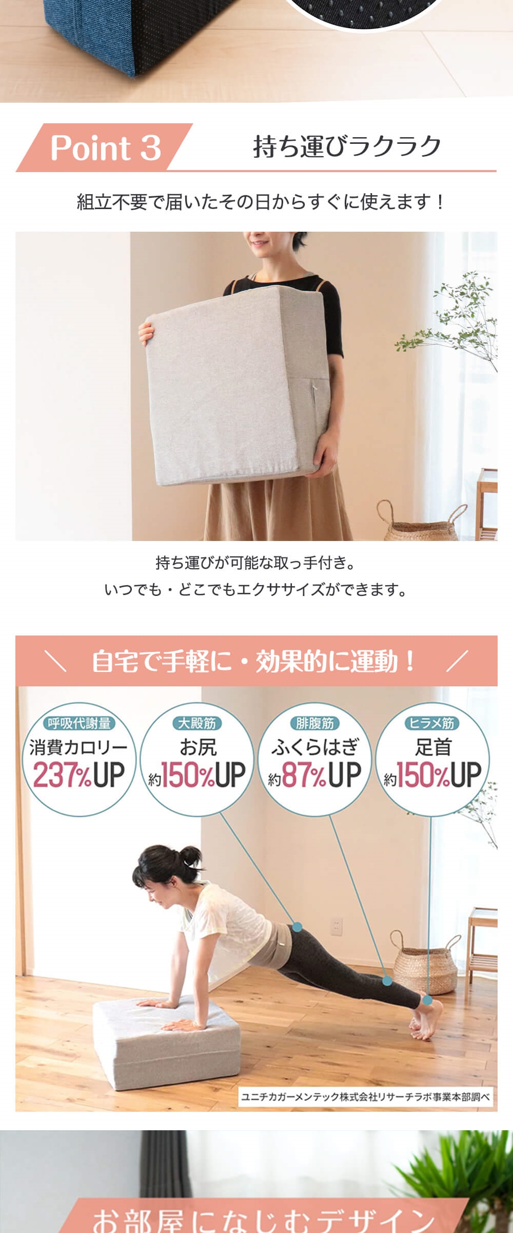 インテリアになじむファブリック素材のクッション型で収納場所にも困りません。運動を行わないときはクッションやオットマンとしてご使用いただけます。また、ハンドルが付いてるため持ち運びがとても便利です!洗濯の際はカバーを取り外し、カバーのみの洗濯なのでお手軽です。