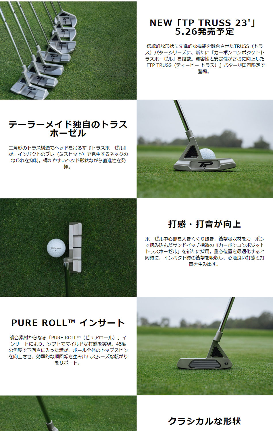 伝統的な形状に先進的な機能を融合させたTRUSS(トラス)パターシリーズに、新たに「カーボンコンポジットトラスホーゼル」を搭載。寛容性と安定性がさらに向上した『TP TRUSS(ティーピー トラス)』パターが国内限定で登場。