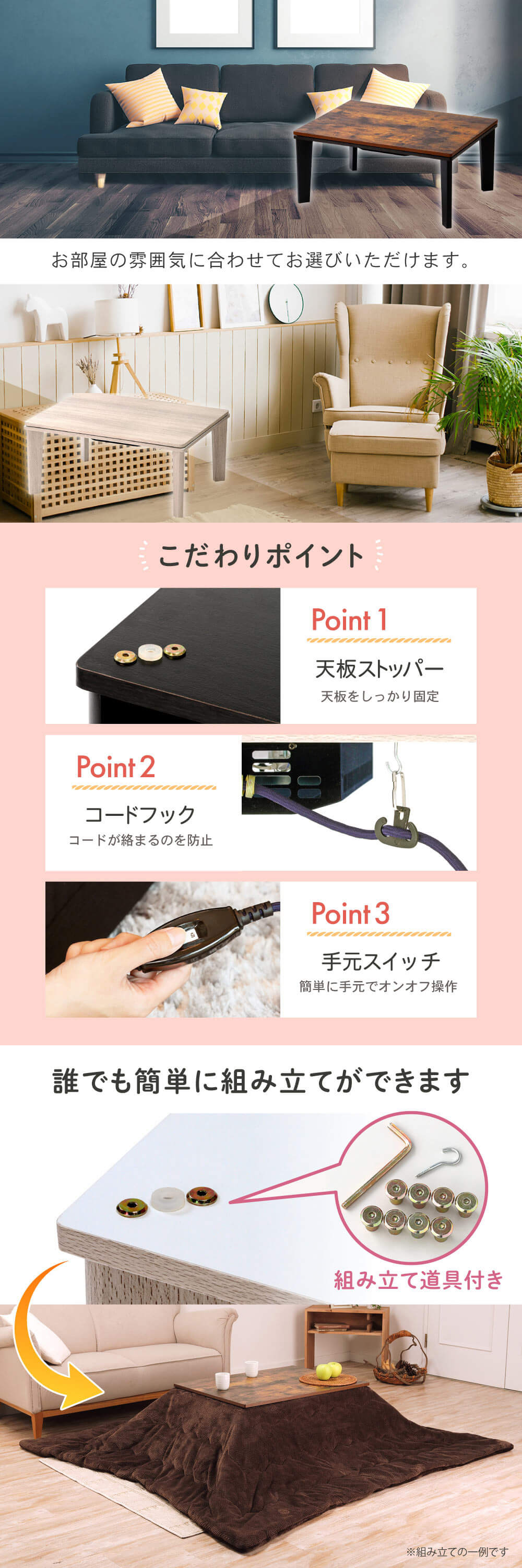 * セット内容:幕板、天板、脚×4、電源コード、ボルト×4、スパナ×1、ドライバー×1