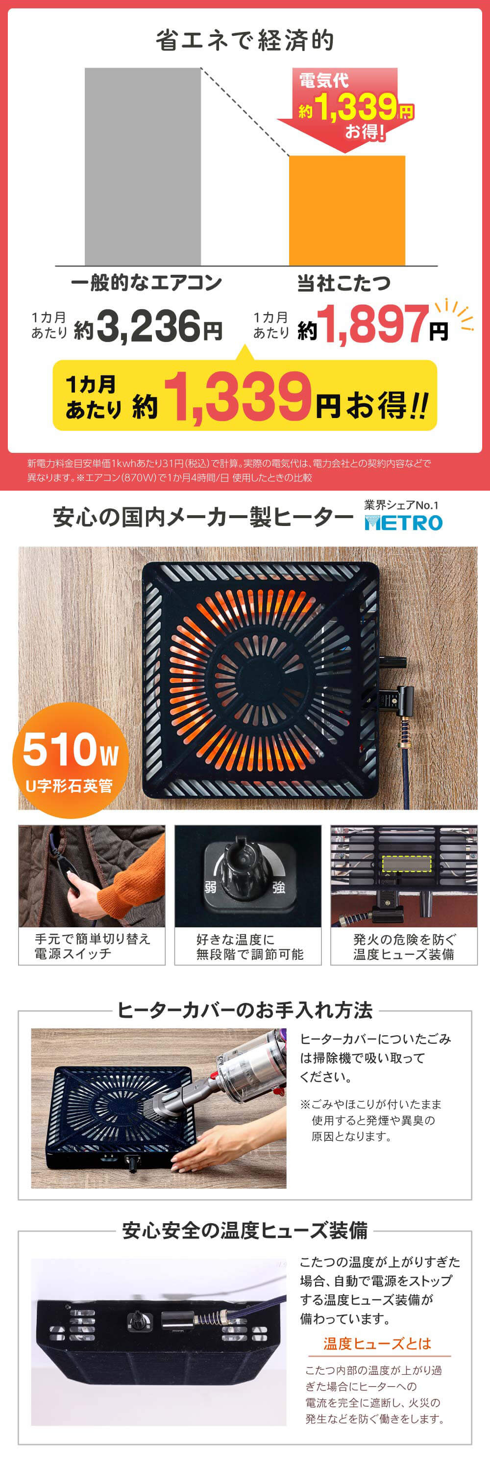 遠赤外線の石英管ヒーターで寒い冬も体の芯まで温まります。