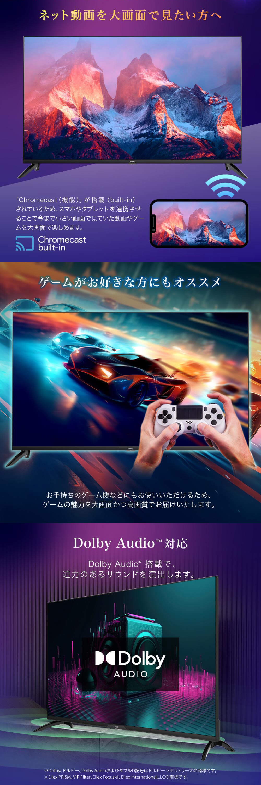 ※Dolby、ドルビー、Dolby Atmos、Dolby Vision、Dolby AudioおよびダブルD記号はドルビーラボラトリーズの商標または登録商標です。