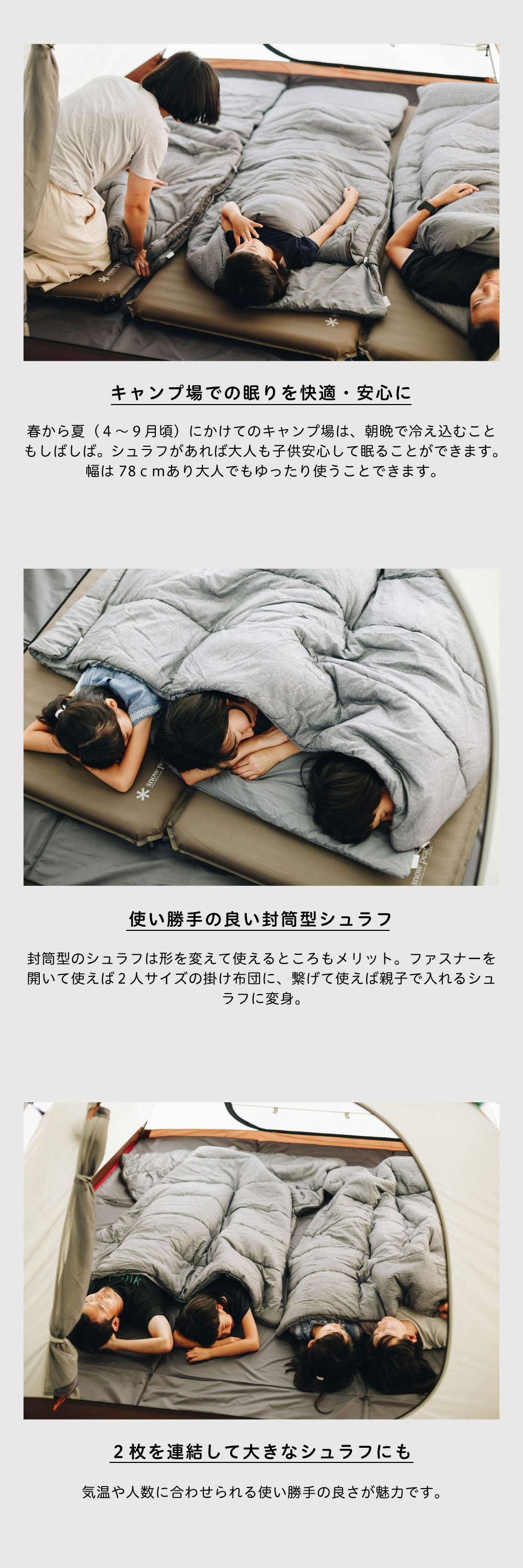 ファスナーを開いて使えば2人サイズの掛け布団に、繋げて使えば親子で入れるシュラフに変身。