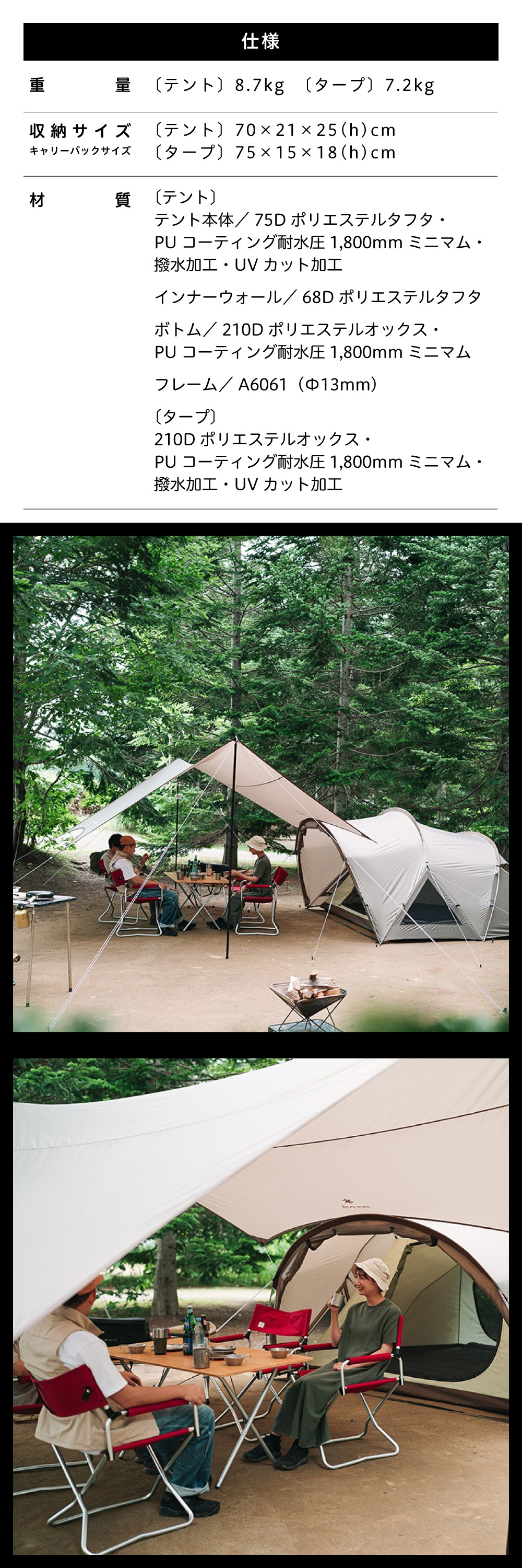 | 収納時サイズ | テント:70×21×25(h)cm タープ:75×15×18(h)cm |