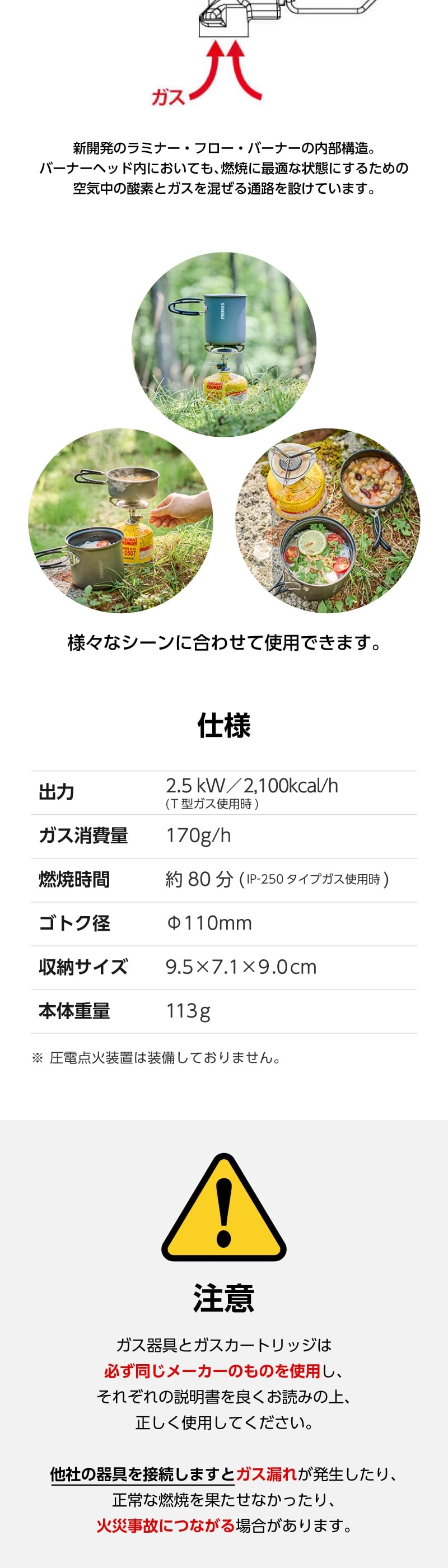 | 燃焼時間 | 約75分(IP-250タイプガス使用時) |