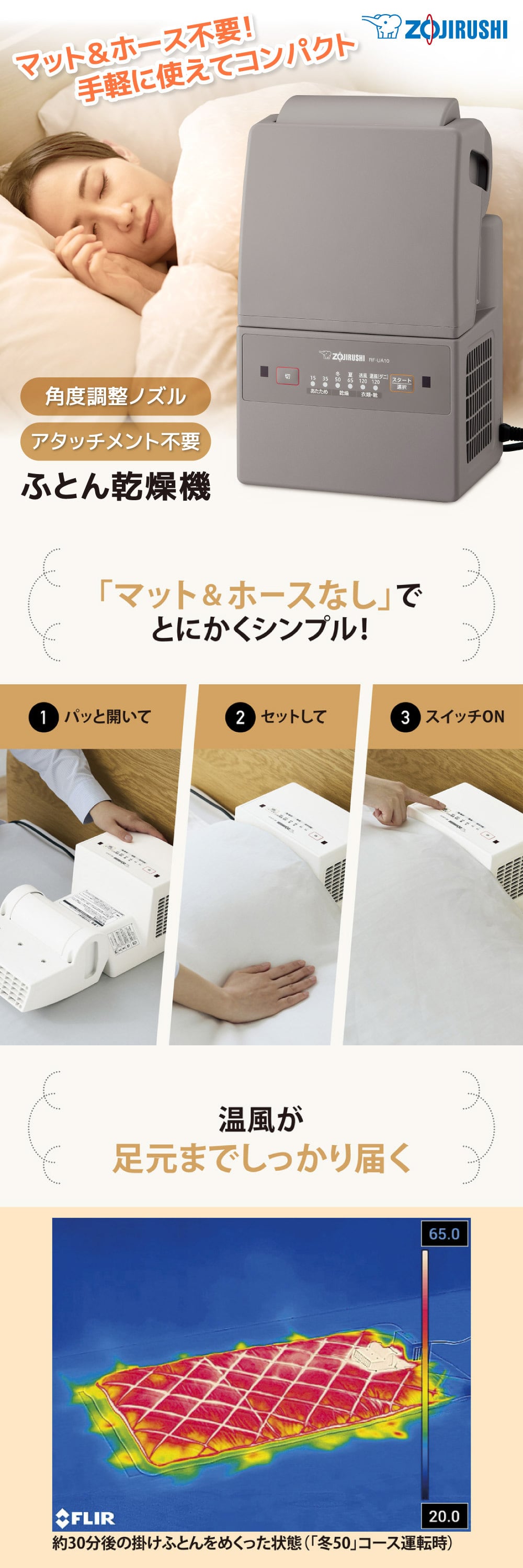 マット&ホースが不要なので、「開く→ふとんをセット→スイッチON」の3ステップで簡単、手軽に使用できます。