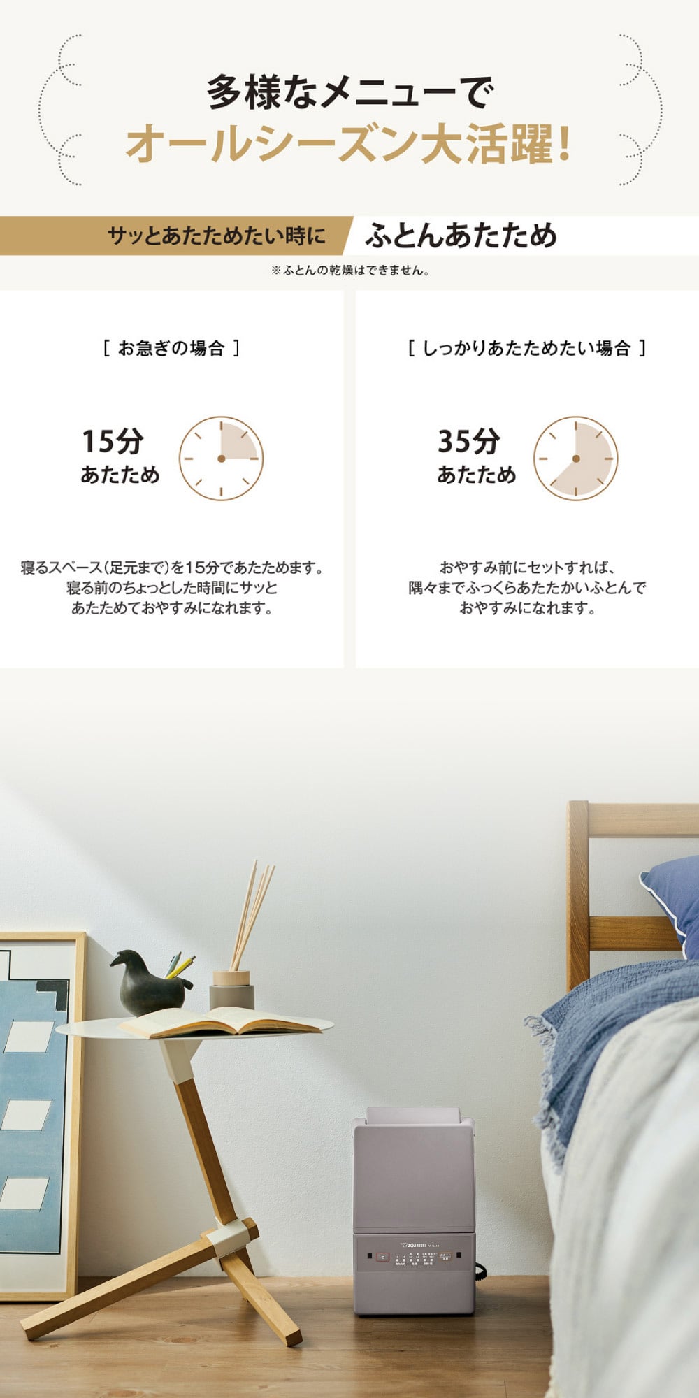 ・ふとんあたため(※ふとんの乾燥はできません。)・・・15分あたため(お急ぎの場合)、35分あたため(しっかり温めたい場合)
