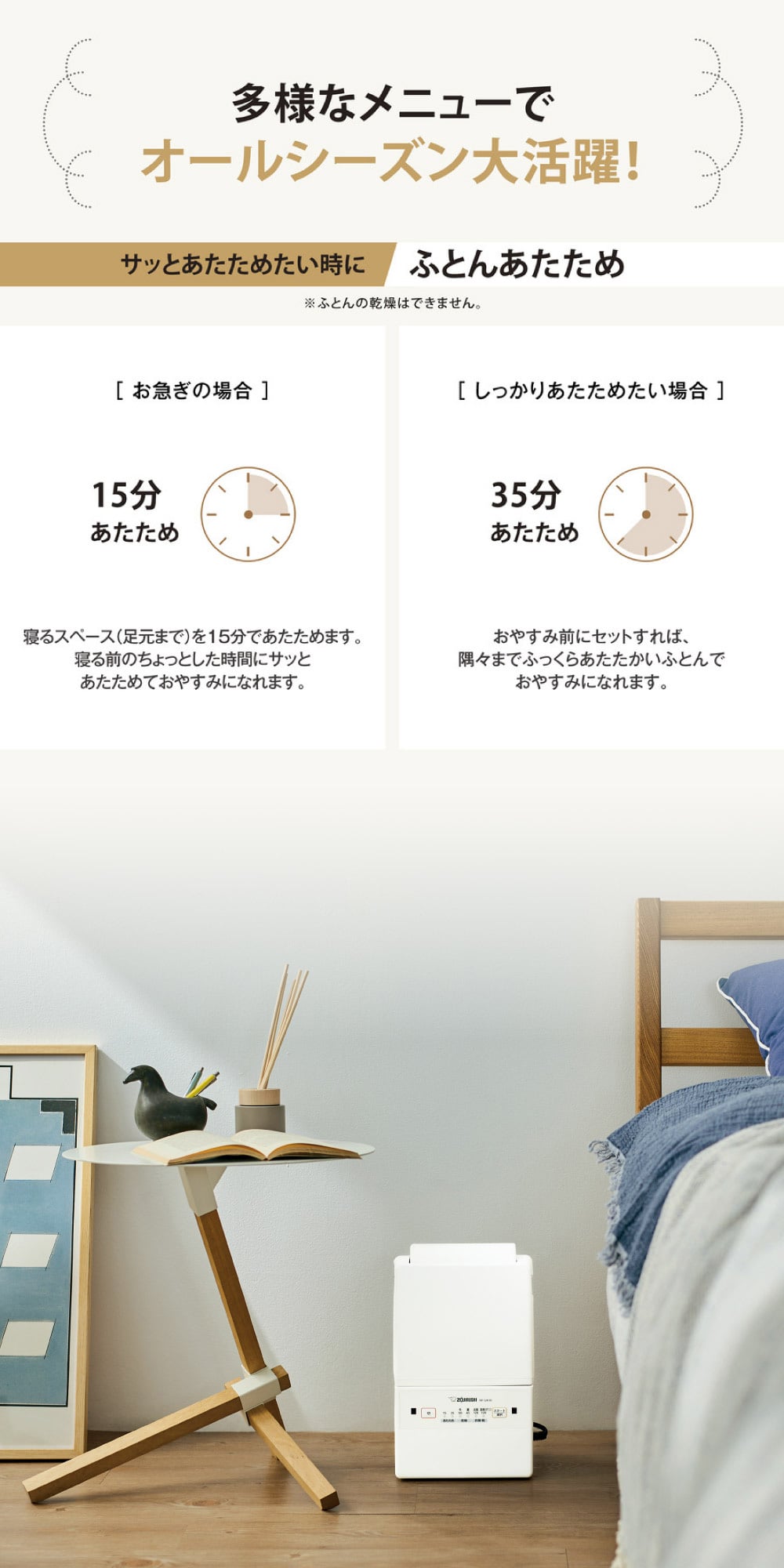 ・ふとんあたため(※ふとんの乾燥はできません。)・・・15分あたため(お急ぎの場合)、35分あたため(しっかり温めたい場合)