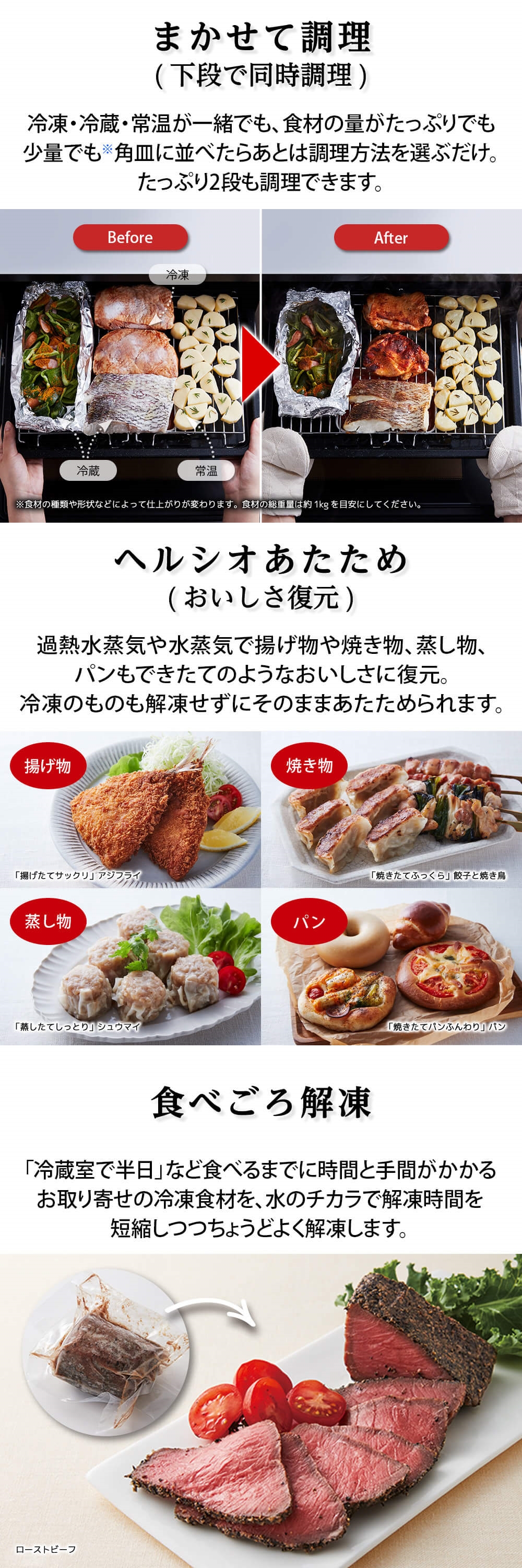 ヘルシオは最初から最後まで水のチカラで調理。だから食材に適度な水分を与えながら中までしっかり加熱するので、ジューシーで素材のおいしさを活かした料理を実現。調理済みのものはできたてのようなおいしさに復元します。パワフルな火力で、冷凍食材の調理やあたためにも強い!