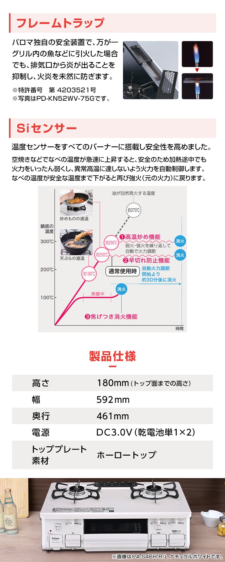 パロマ独自の安全装置で、万が一グリル内の魚などに引火した場合でも、排気口から炎が出ることを抑制し、火炎を未然に防ぎます。