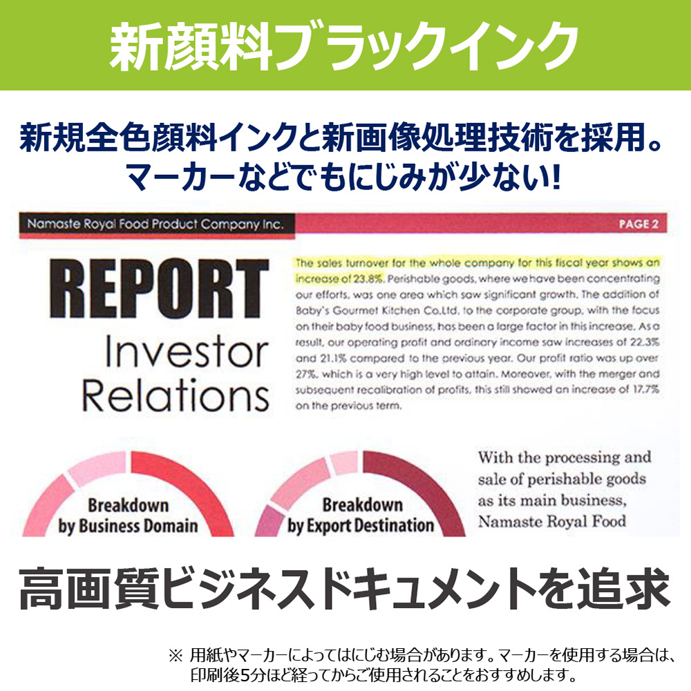 新顔料ブラックインクと新画像処理技術により、文字のにじみの原因を低減。働く場がオフィスでも自宅でも、高品質なビジネスドキュメントをお届けします。