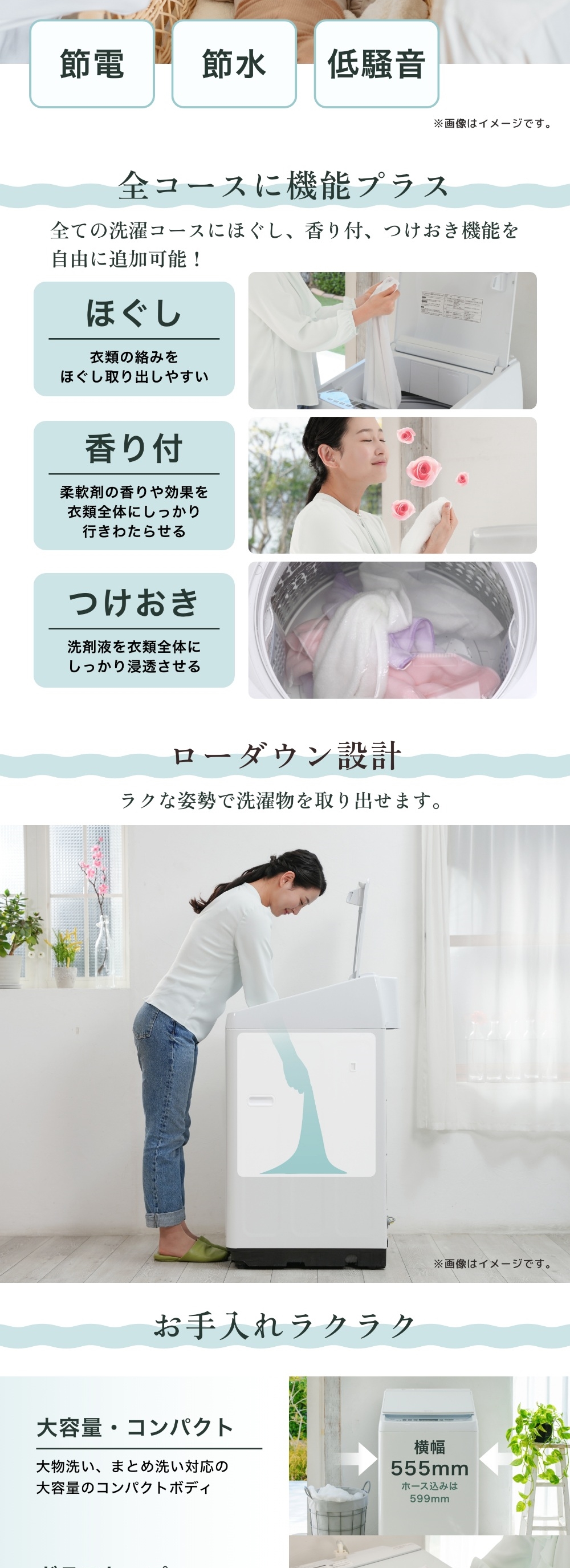 また振動も少なく低騒音なので早朝や夜間の洗濯も安心です。