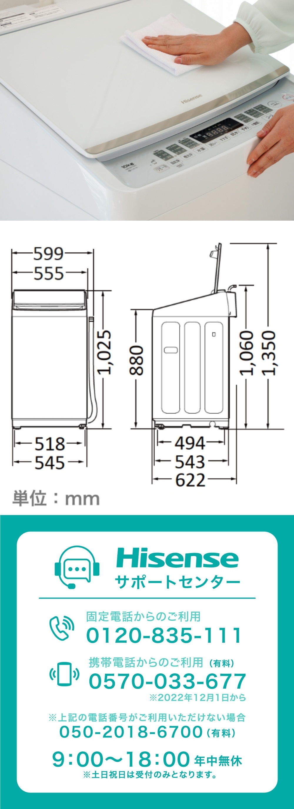 | 幅x高さx奥行き | 幅(排水ホースを含む)599(ボディ幅:555)×高さ1060×奥行622 mm |