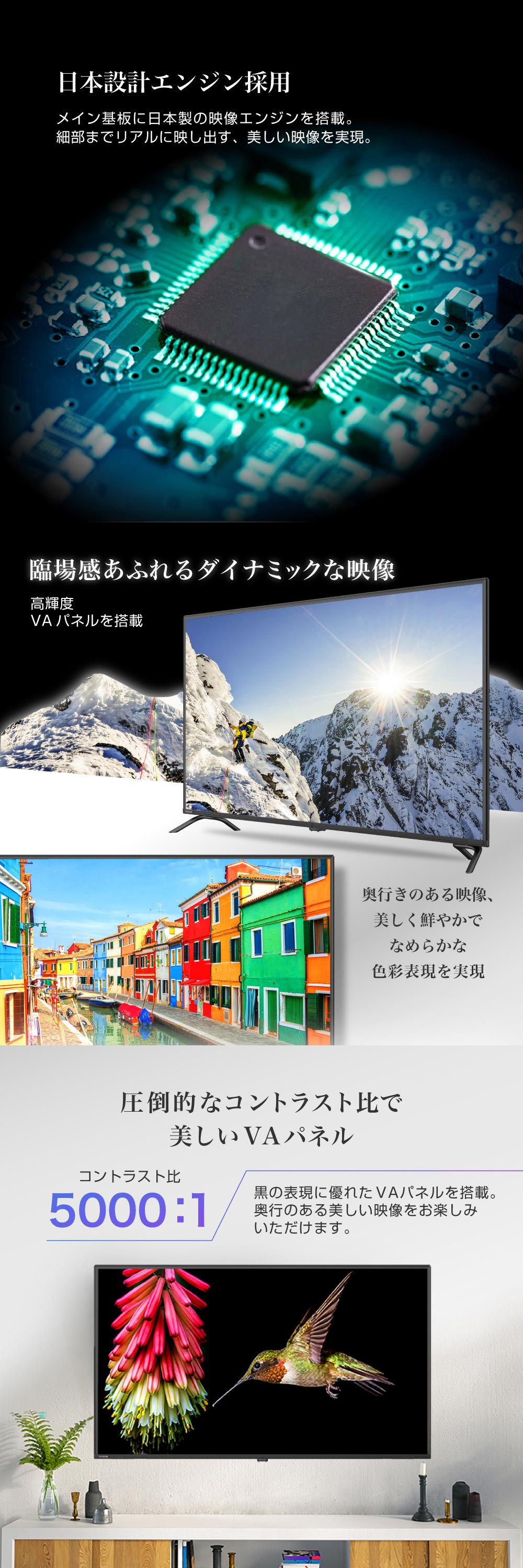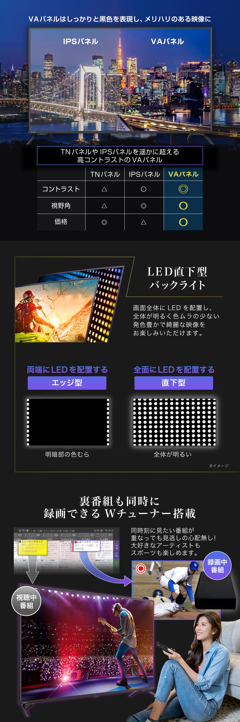 黒の表現に優れたVAパネルを搭載。奥行のある美しい映像をお楽しみいただけます。