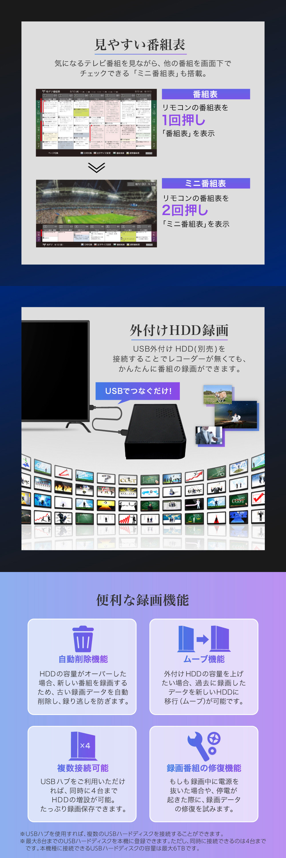 USB外付けHDD(別売り)を接続することでレコーダーが無くても、かんたんに番組の録画ができます。