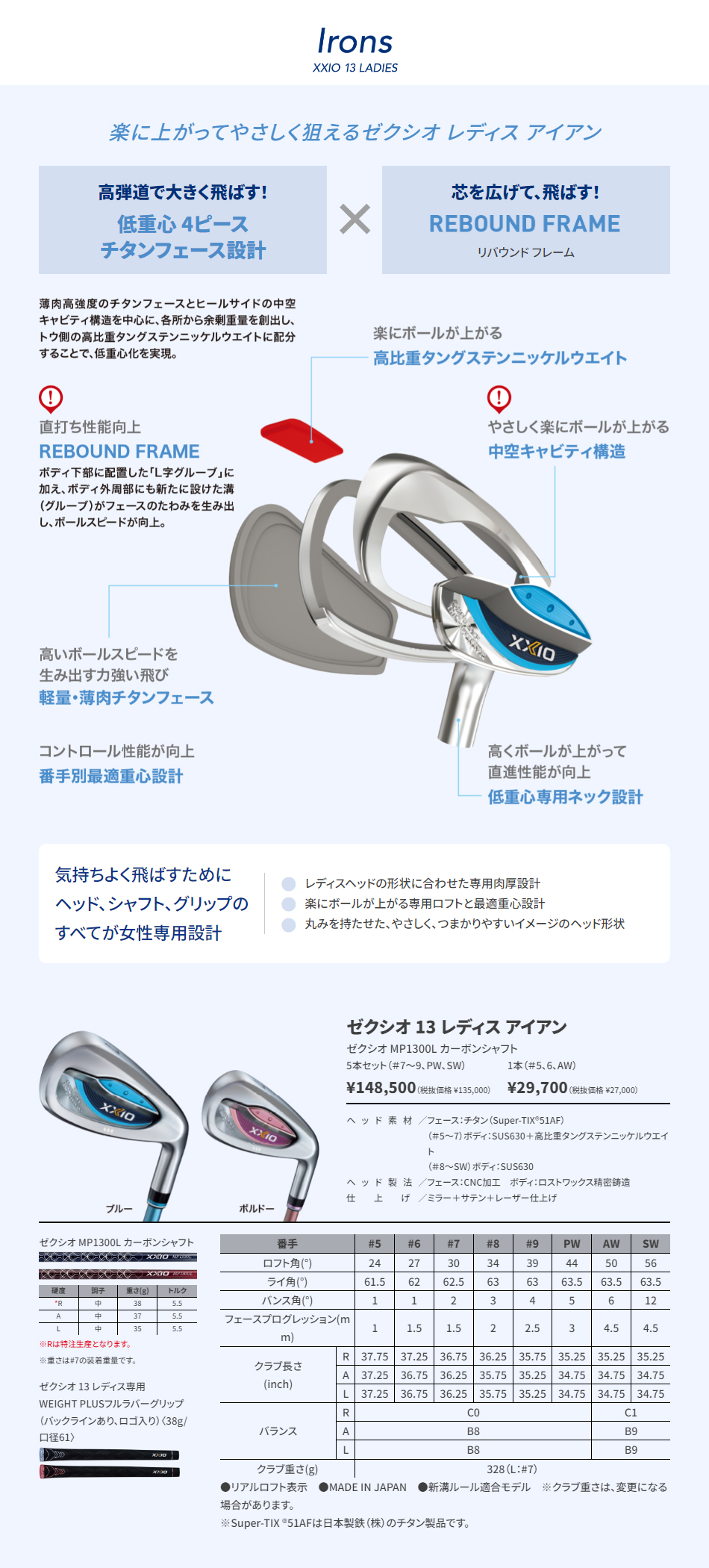 チタンフェースの4ピース複合構造による徹底した低重心設計とアイアン版「REBOUND FRAME」が高く伸びる弾道でやさしく大きく飛ばせるゼクシオ 13 レディス アイアン。